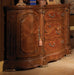 Discover elegance in every curve of the Cortina Collection. From the graceful lines of its deep carvings to the crowning feature of its marble cameo, every inch of Cortina exudes a stately presence. Decorative metal footings, seeded glass, light chandeliers, and unique design elements enhance its kinetic appeal. Embraced in a Honey Walnut finish, Cortina is truly a work of art. This grand piece features a beautiful wood top with a marble inlay. Featuring a top center drawer with decorative keyhole, two side jewelry drawer columns with medallion pulls, two center drawers, middle and bottom, with cedar inlays, and four oval bronze feet.