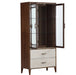 AICO Furniture Houston Display Cabinet in Walnut 9095209-416. The Houston Display Cabinet combines modern refinement with practical elegance. Crafted in a rich walnut finish, its beveled glass doors open to reveal spacious shelves, each adjustable to accommodate your display needs. Integrated LED lighting illuminates your collections, while the mirrored back panel enhances the depth and brilliance of your showcased pieces. Below, two velvet-lined drawers with soft-closing glides offer concealed storage, accented by a contrasting starburst-patterned gray front with a subtly textured surface. Gold trim outlines the design, while the sleek wood-and-metal handles complete the look with a sophisticated touch.