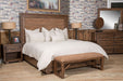 Aico Carrollton Queen Panel Bed with Fabric Insert in Rustic Ranch KI-CRLN000QN-407. With the organic tones of ranch styling and the sophistication of modern rustic influences, Carrollton Bedroom Collection by Michael Amini and Kathy Ireland Design Collaboration brings a reclaimed warmth to furniture design. Fine metal accents, layered wood construction, and soft heather textures all offer a stately style for inviting homes.