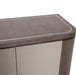 - Cabinet fronts are wrapped in frost gray faux shagreen