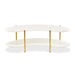 AICO Furniture Sassani Cocktail Table in Pearl White/Gold LFR-SSNI201-128. A striking blend of modern design and sleek elegance, the Sassani Cocktail Table features a two-tiered structure finished in a luxurious pearl white lacquer. The soft, organic shapesof the tiers are complemented by slim, gold metal legs, adding a touch of contemporary. Sophistication.