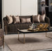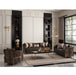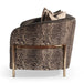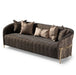 AICO Furniture Lisbon Sofa in Onyx Gold LFR-LSBN815-ONX-806. A true masterpiece designed to elevate your living space. Adorned with exquisite curves, this eye-catching piece features a gleaming gold metal show frame that accentuates its luxurious appeal. The front body is elegantly draped in rich shades of Onyx chenille, while the back boasts a stunning Tiger Eye chenille jacquard, creating a harmonious blend of texture and color. Matching pillows in a black pearl chenille jacquard fabric with obsidian accents complete the look.
