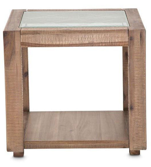 AICOHudson Ferry Collection by AICO Furniture Driftwood finish Constructed with Acacia wood solids and veneer Glass diamond pattern top Open bottom sh...