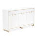 AICO Furniture Palm Gate Sideboard in Cloud White N9086007-108. The Palm Gate sideboard exemplifies a seamless blend of functionality and refined elegance. Showcased in a Cloud White acrylic finish complemented by exquisite Japan gold accents, this sideboard brings a modern yet timeless charm to any room. It features adjustable shelving within the cabinets for tailored storage solutions and drawers lined with plush velvet to gently cradle your essentials. With its sleek lines and sophisticated design, this sideboard is not just a piece of furniture—it's a centerpiece that elevates your dining experience.